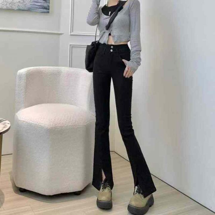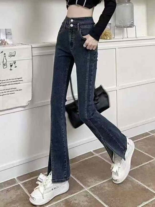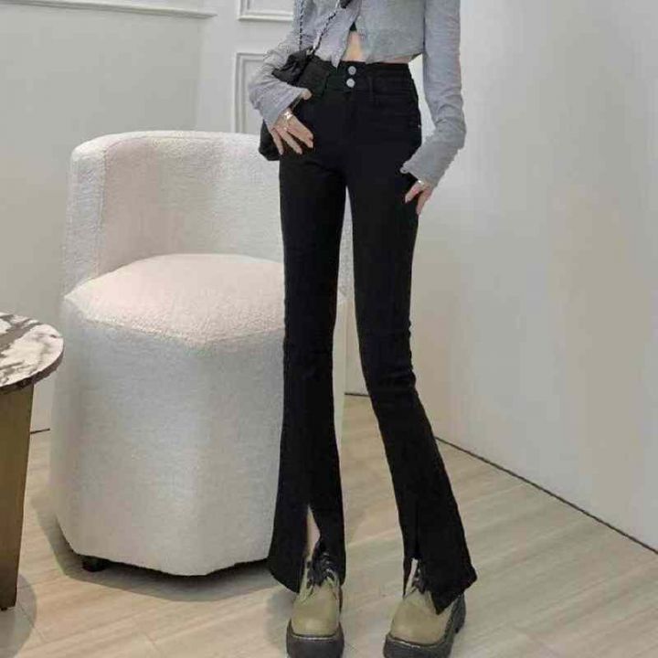 秋季新款高弹力微胖mm洗水棉网红爆款开叉牛仔喇叭裤,...