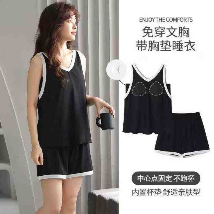 天猫在售款8500件高品质冰丝螺纹纯欲风女士宽松版家居服背心套装,高弹力带胸垫,单款三色,S-3XL,独立包装带吊牌