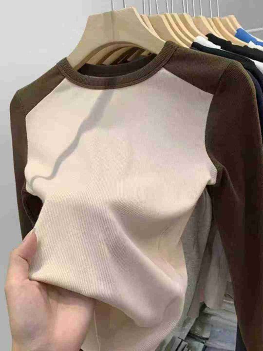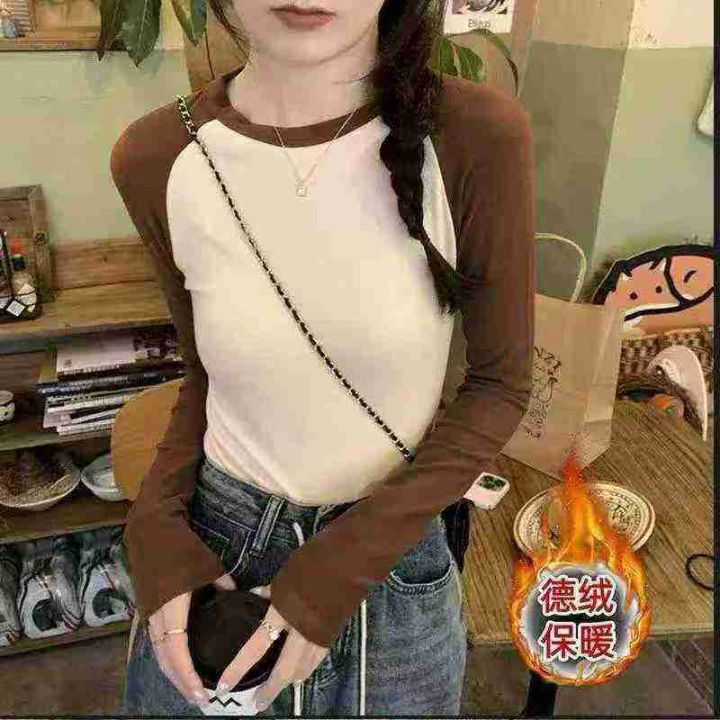 德绒圆领长袖秋冬季新款撞色修身百搭打底保暖上衣,独...