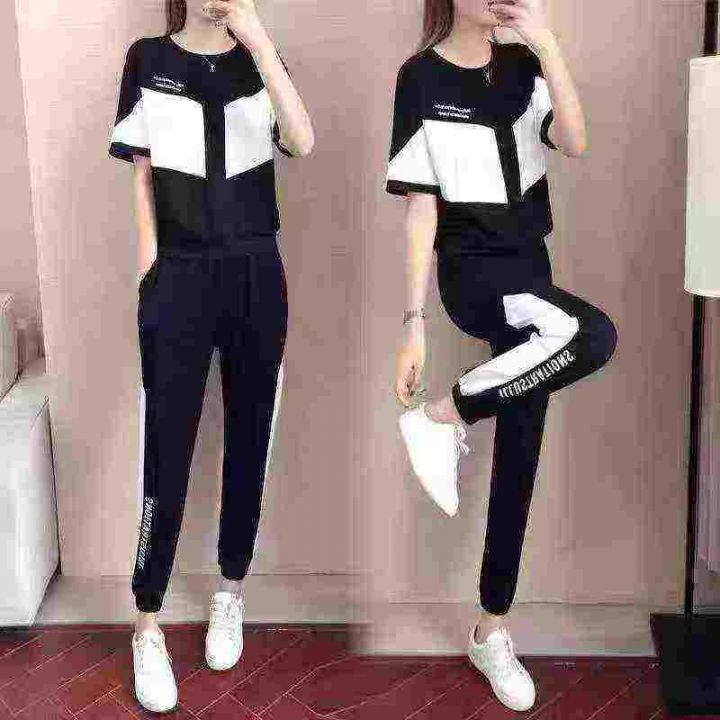 高腰运动套装女夏新款欧货时尚短袖宽松减龄休闲两件套...
