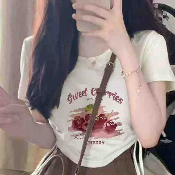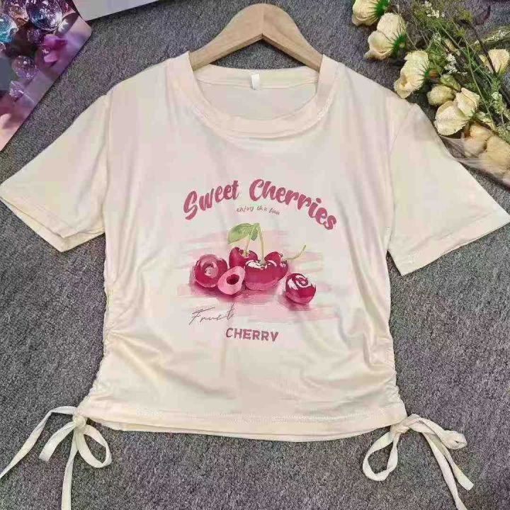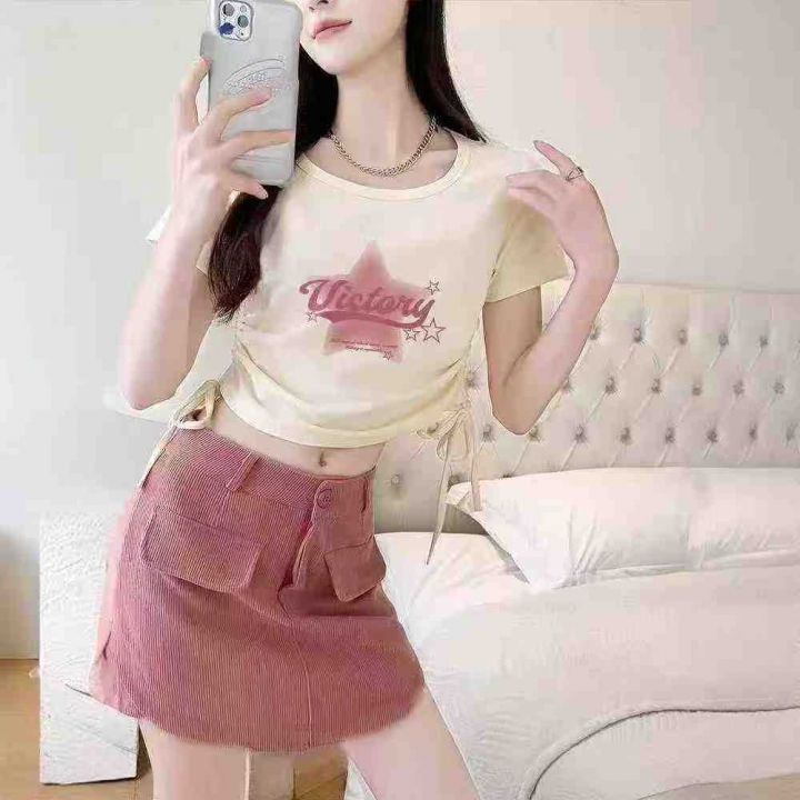 2025夏季辣妹抽绳设计百搭新款短款上衣多巴胺修身收腰短袖t恤女,整款单色两个图案,独立包装,1.3.5码,436件左右,4.9清分➕1