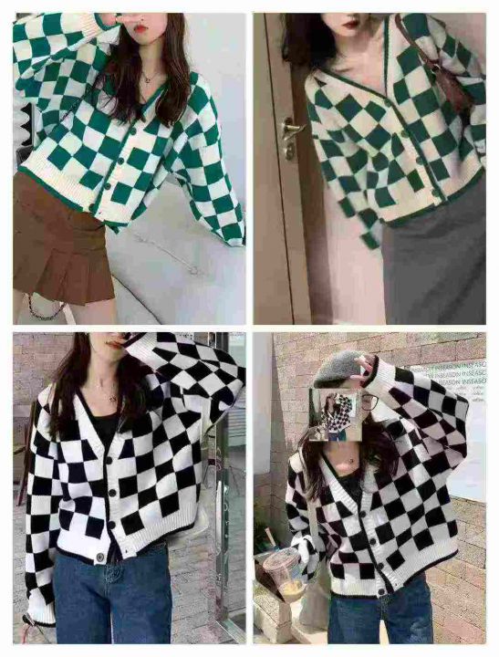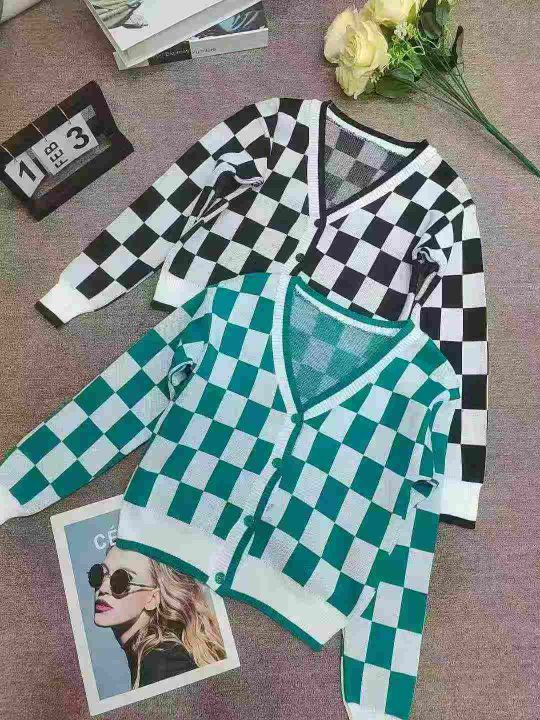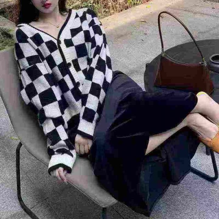 棋格子毛衣外套女春秋季2025新款复古日系慵懒风大版宽松V领针织开衫,独立包装,370件,清8.8,分➕1