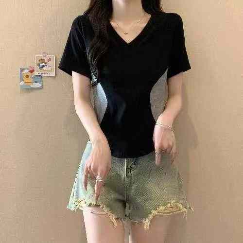 上新全清:6.8一件甜辣V领设计感撞色拼接修身显瘦上衣,[爱心]130件左右,...