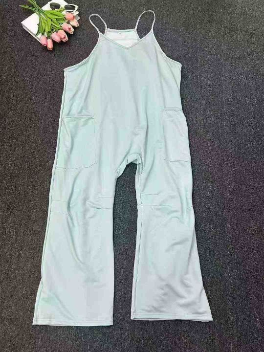 欧美大码V领胖MM浅绿色口袋宽松休闲吊带连体裤,独立包装,700件,S-2XL,全清6.8分货➕1
