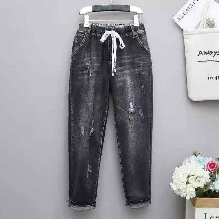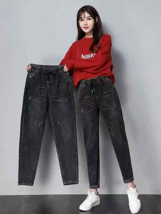 ☕️高弹力松紧腰牛仔裤女高腰大码胖mm哈伦裤直筒显瘦...