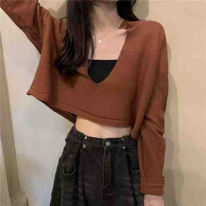 秋季新品法式宽松短款慵懒v领长袖针织衫,独立包装,...
