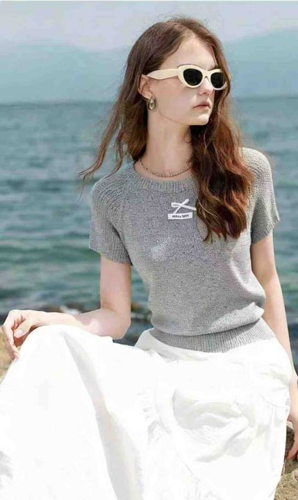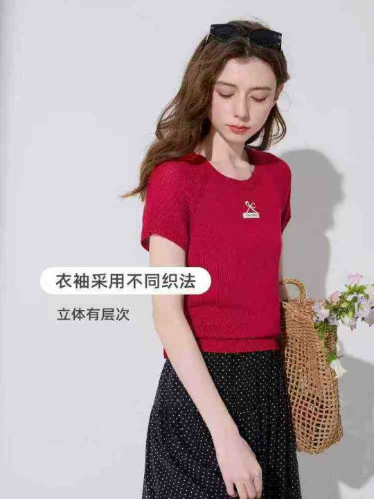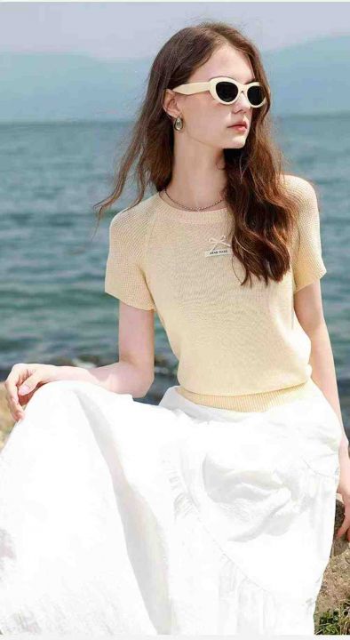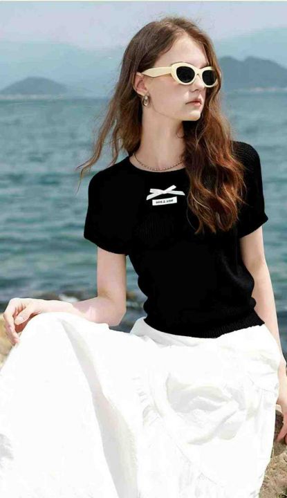 夏季新款弹力修身显瘦蝴蝶结针织短袖,独立包装,均码...