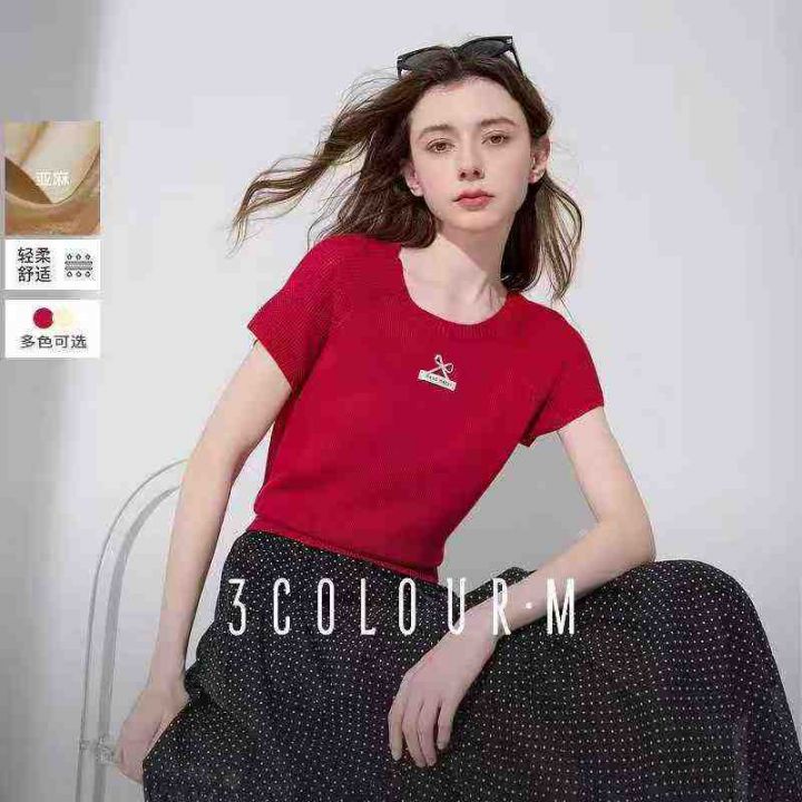 夏季新款弹力修身显瘦蝴蝶结针织短袖,独立包装,均码...