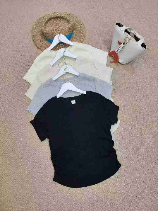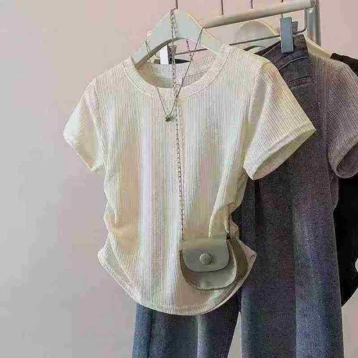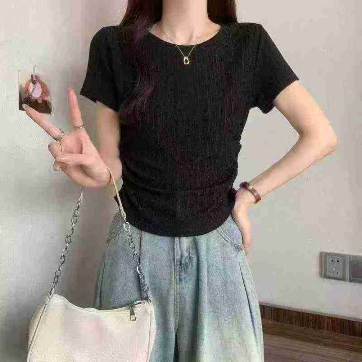 [月亮]:褶皱收腰显瘦气质简约短袖T恤