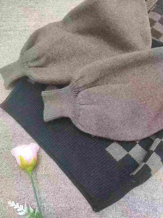 春秋新款棋盘格别致假两件毛衣小众灯笼袖针织上衣,独立包装,均码,190件,清8.5,分➕1