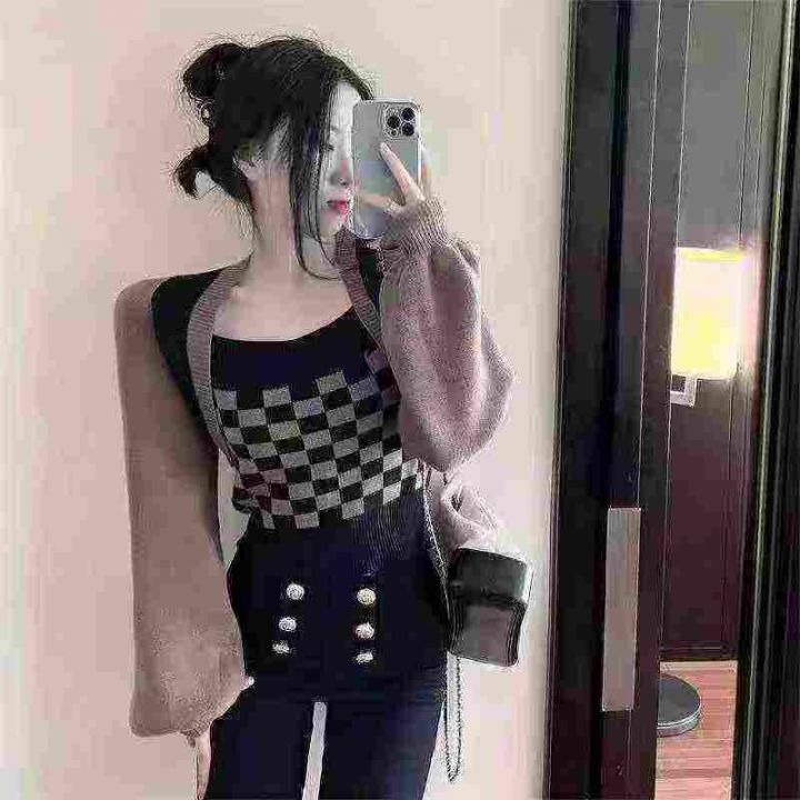 春秋新款棋盘格别致假两件毛衣小众灯笼袖针织上衣,独立包装,均码,190件,清8.5,分➕1