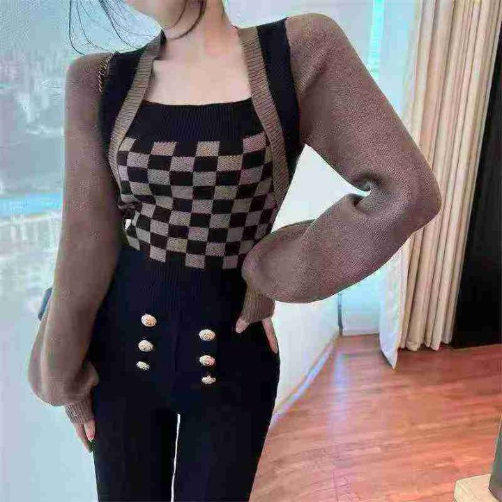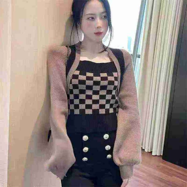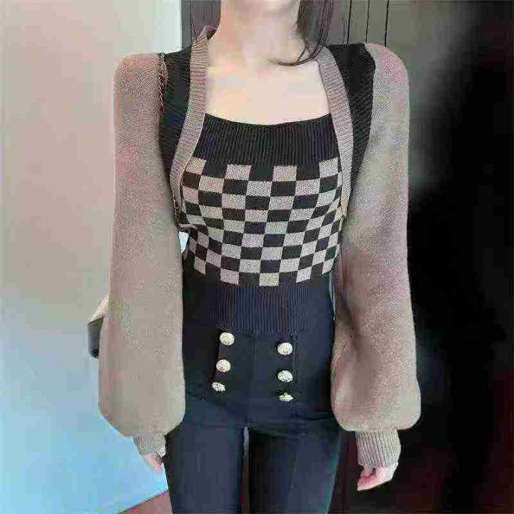 春秋新款棋盘格别致假两件毛衣小众灯笼袖针织上衣,独...