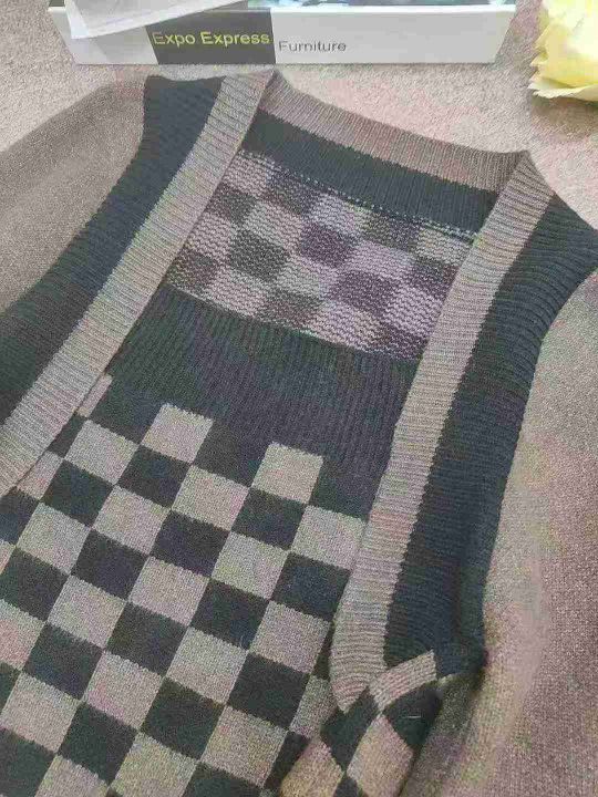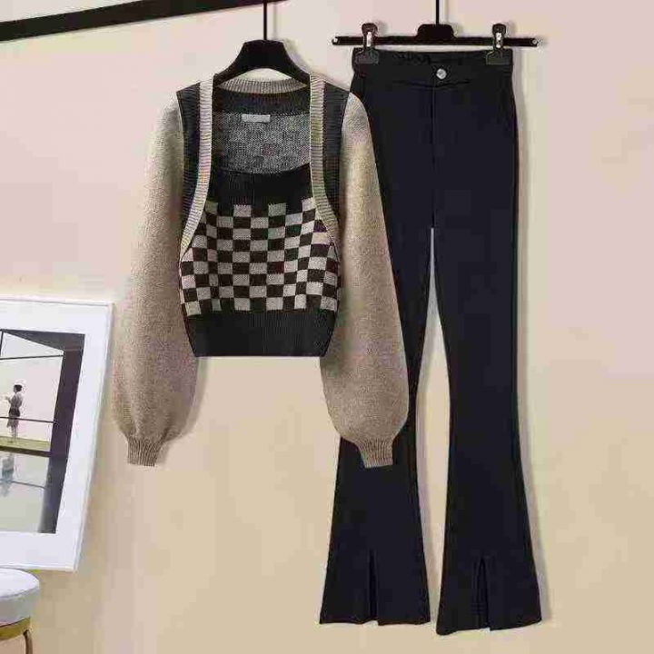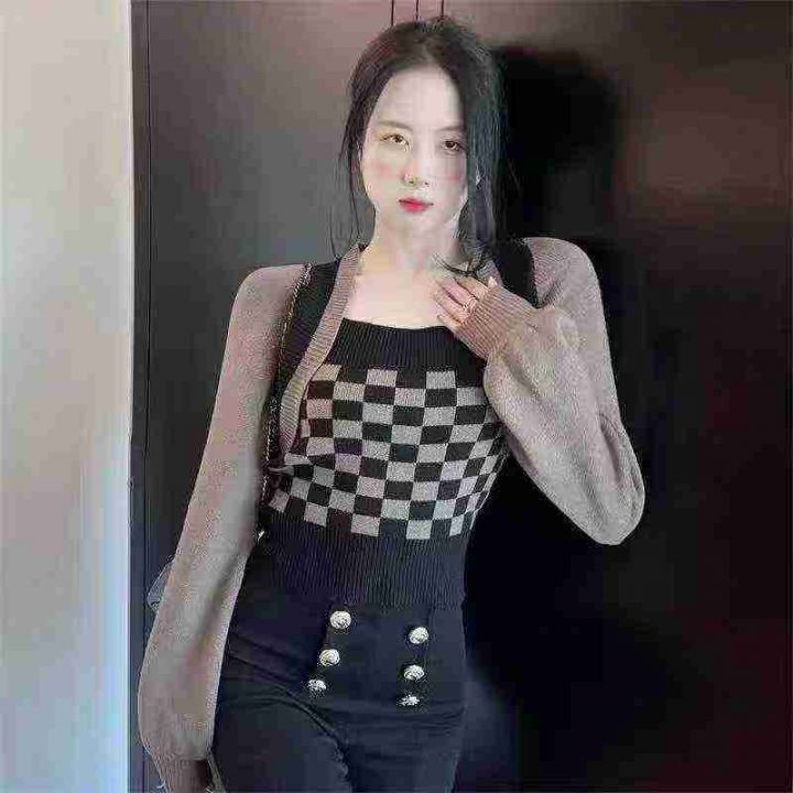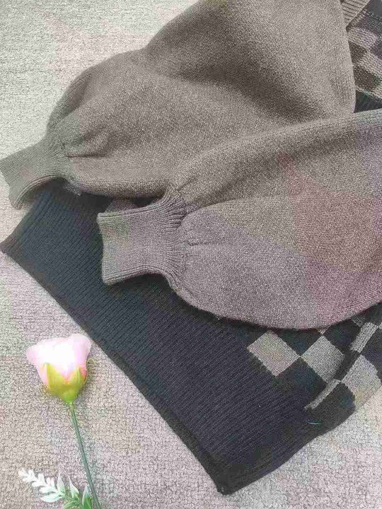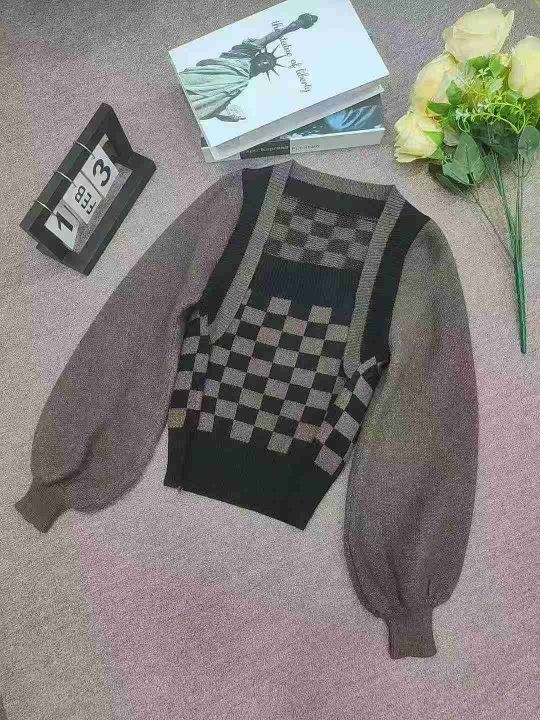 春秋新款棋盘格别致假两件毛衣小众灯笼袖针织上衣,独立包装,均码,190件,清8.5,分➕1