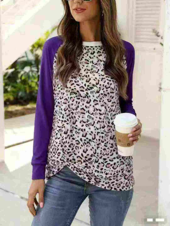 欧美时尚豹纹拼色长袖圆领上衣服,下摆褶皱小设计,数量290件左右,码数S-2XL,整款多色,品质好有独立包装。