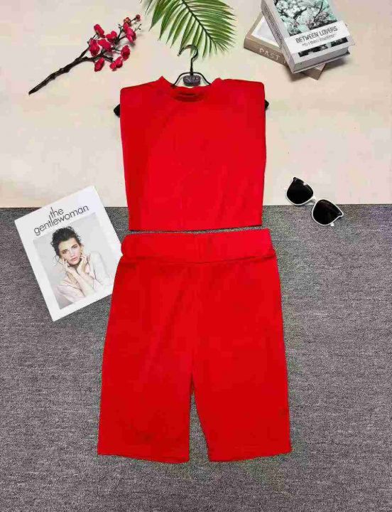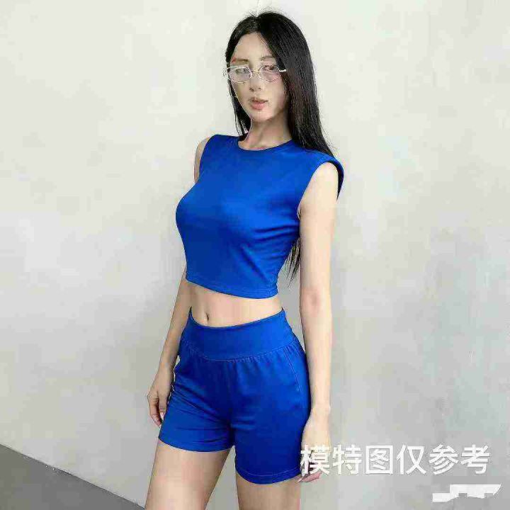 时尚显瘦肩垫无袖上衣加紧身短裤两件套,整款四色,数量196套,码数S-2XL,高弹力,品质好,有独立包装。