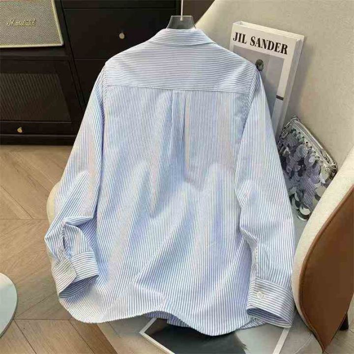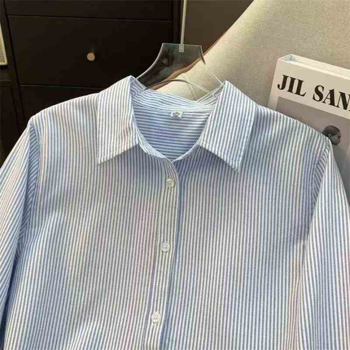 新款夏款简约时尚牛津纺竖条纹衬衫衬衣女长袖休闲百搭叠穿打底衬衫上衣潮,独立包装,码数L,数量1500件左右