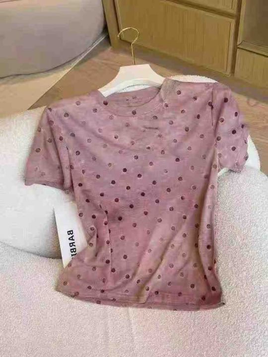 重工晕染波点圆领短袖T恤女夏季设计感显瘦遮肉气质上衣,整款2色,紫色为主,弹力超大,2到5码,3200件左右,4.9秒杀,分货加1