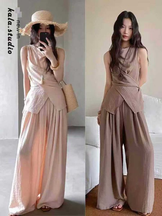 法式套装会呼吸麻感背心绑带上衣女夏松紧腰宽松休闲裤...