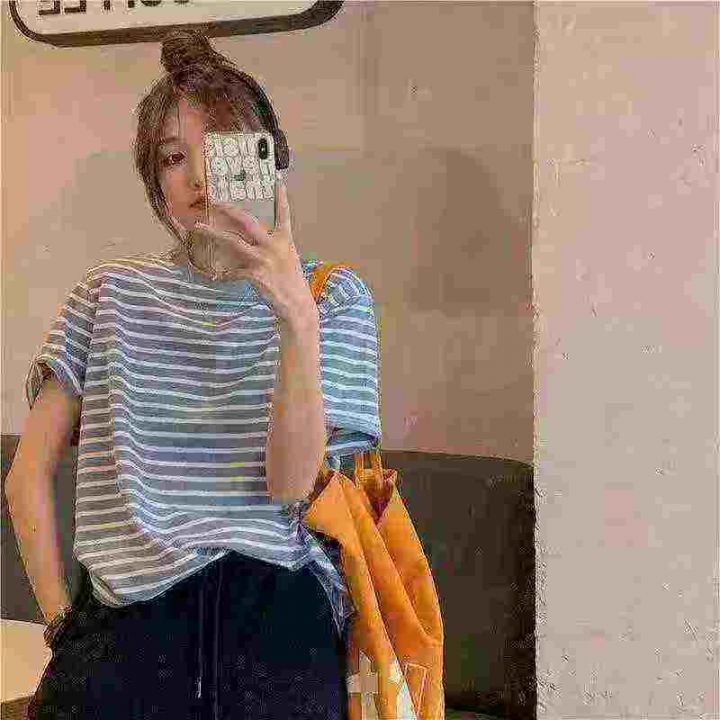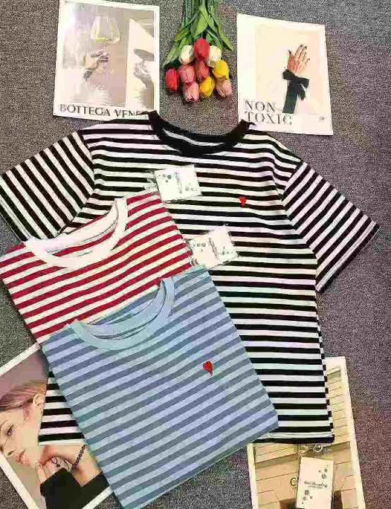上新全清:6.8一件小众设计感撞色条纹爱心刺绣纯棉宽松T恤,[爱心]100件左...