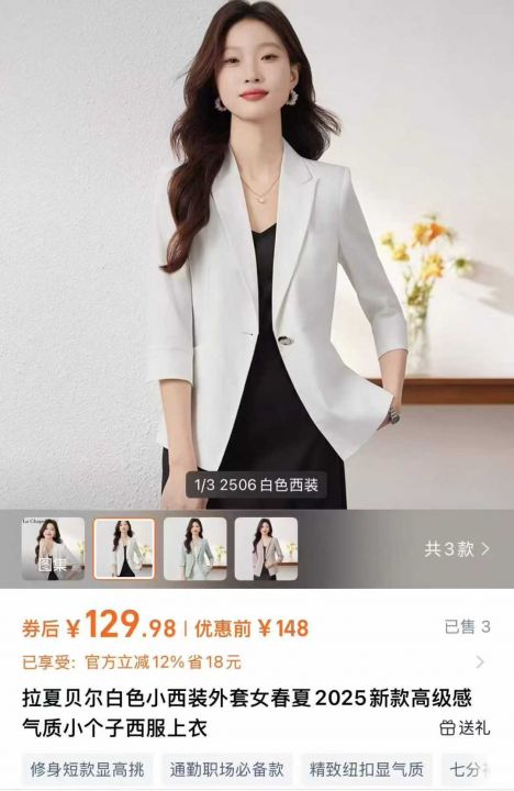 天猫精选200件 天猫在售款 春夏高级感气质小个子西服外套上衣,整款三色,内衬都有包边,做工精细,有肩垫,高品质可入实体店 精美独立包装 S~4XL码 全清15.8元