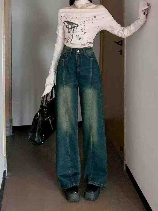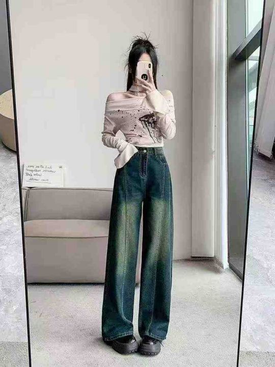 秋季新品洗水棉网红复古蓝直筒阔腿牛仔裤,独立包装,...