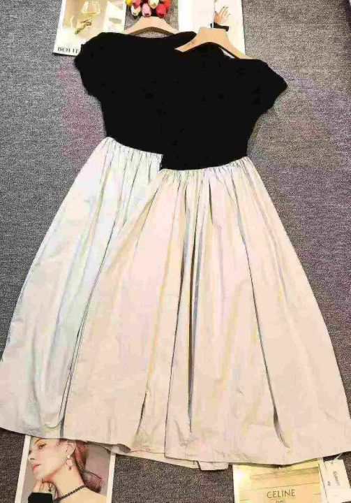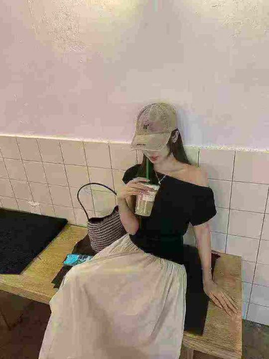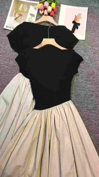 韩系撞色拼接一字肩收腰过膝连衣裙,[爱心]215件左右,单款两个色,杏色为主,码数S-L,穿80-130斤,万佳档口货,原包装️无瑕疵,[666]实体店品质,分货加一