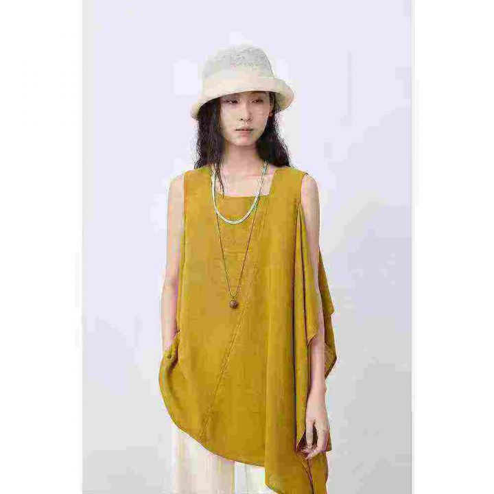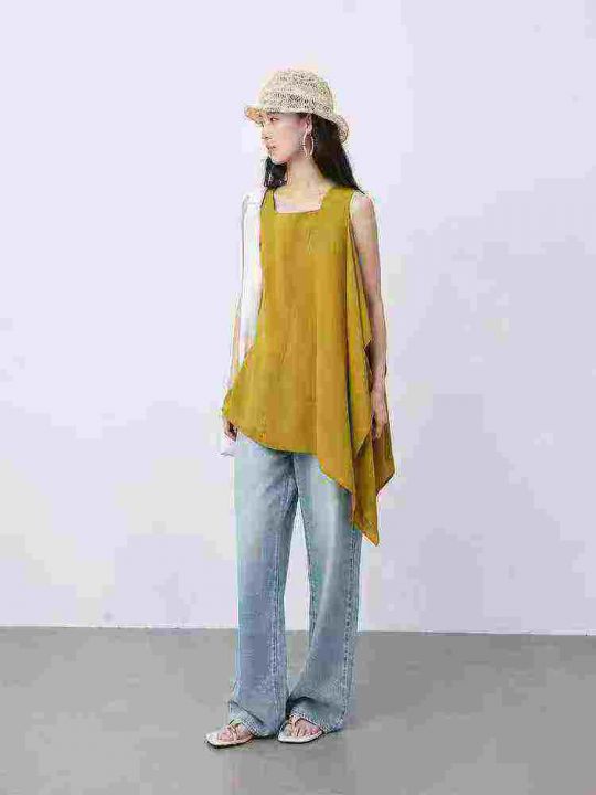 小众姜黄色亚麻不规则荷叶边无袖上衣,[爱心]65件左右,款号#7208码数M-L,穿80-130斤,万佳档口货,原包装️无瑕疵,[666]实体店品质,分货加一