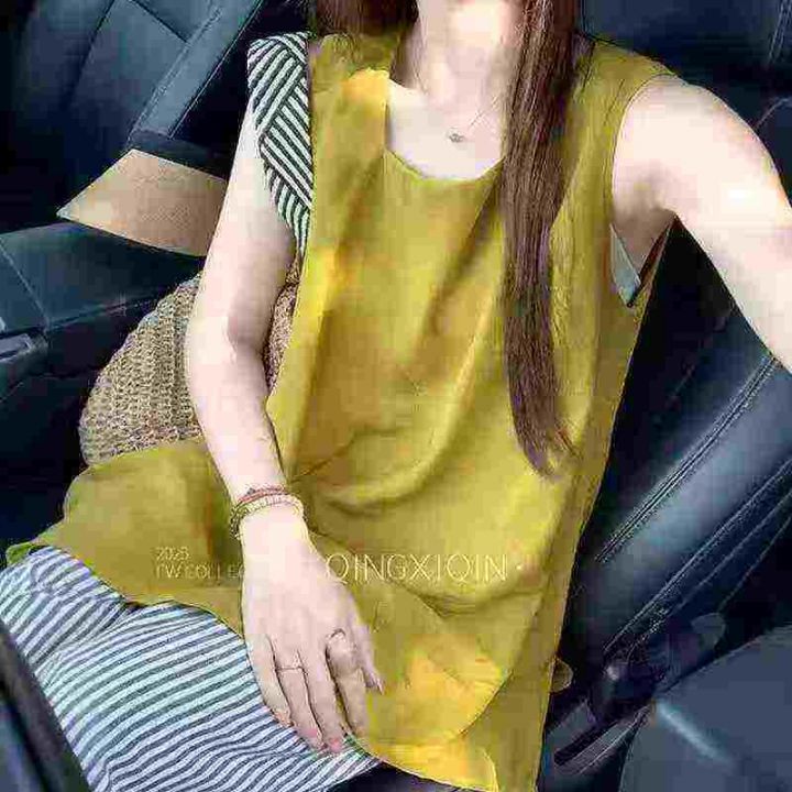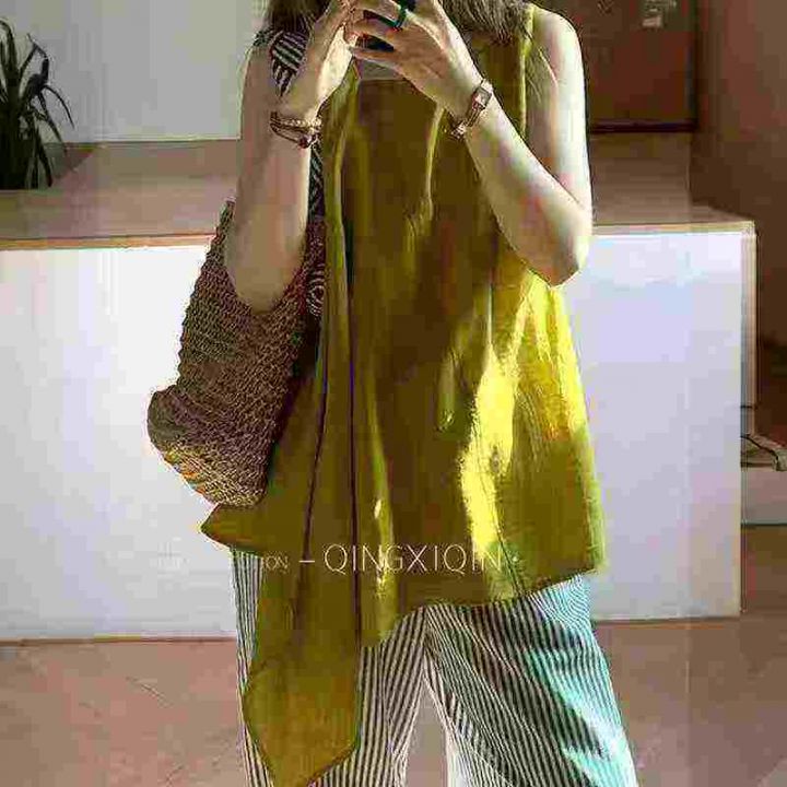 小众姜黄色亚麻不规则荷叶边无袖上衣,[爱心]65件左右,款号#7208码数M-L,穿80-130斤,万佳档口货,原包装️无瑕疵,[666]实体店品质,分货加一