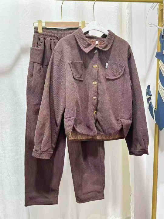 翻领灯芯绒保暖套装女2025冬季加绒加厚宽松显瘦卫衣直筒裤两件套,数量230...
