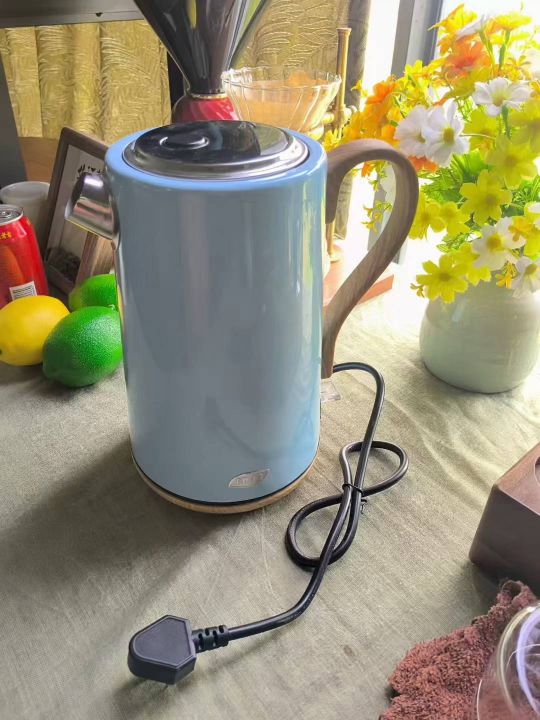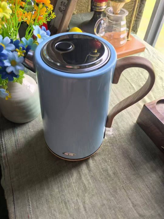浅蓝色壶身,水壶中非常少见的颜色。木纹手柄+木纹底坐
