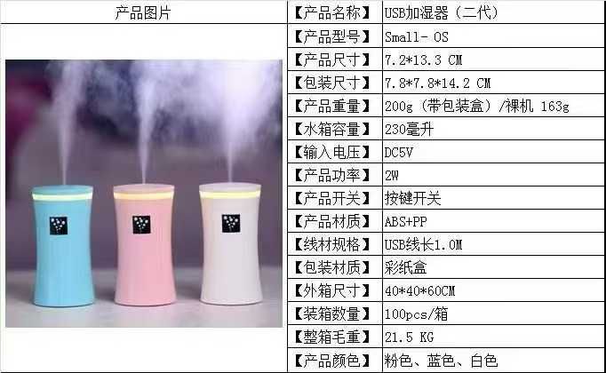 Anion 品牌USB加湿器,三色可选。水箱容量230ml,原箱原件60pcs/箱,到货36...