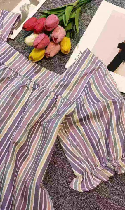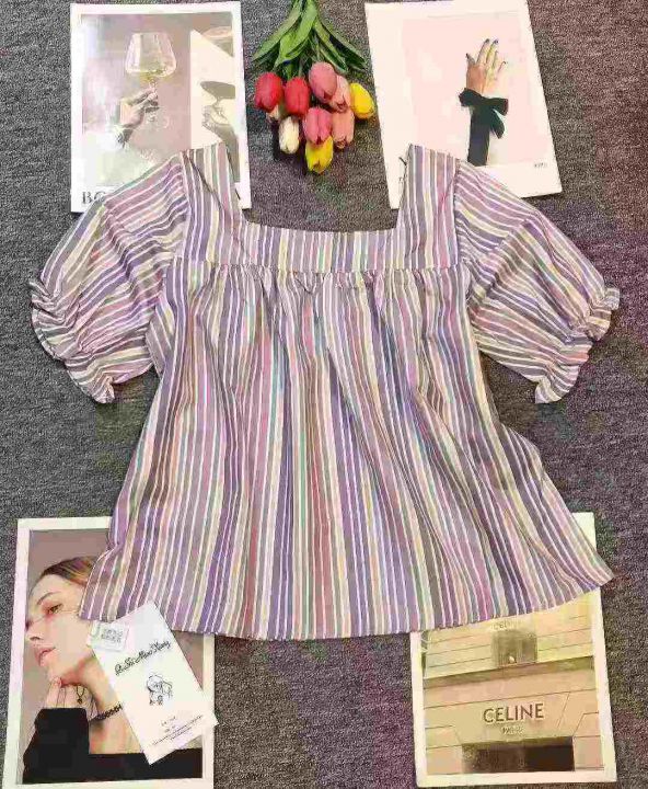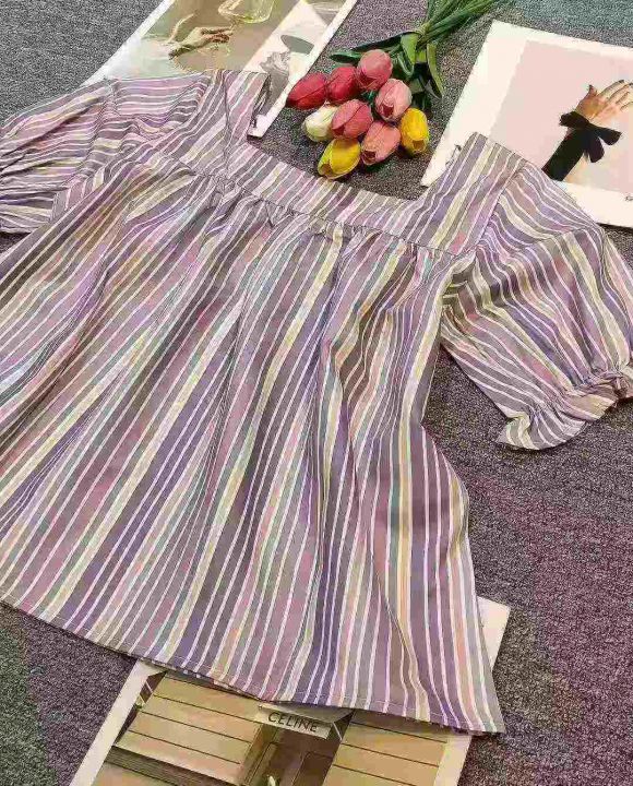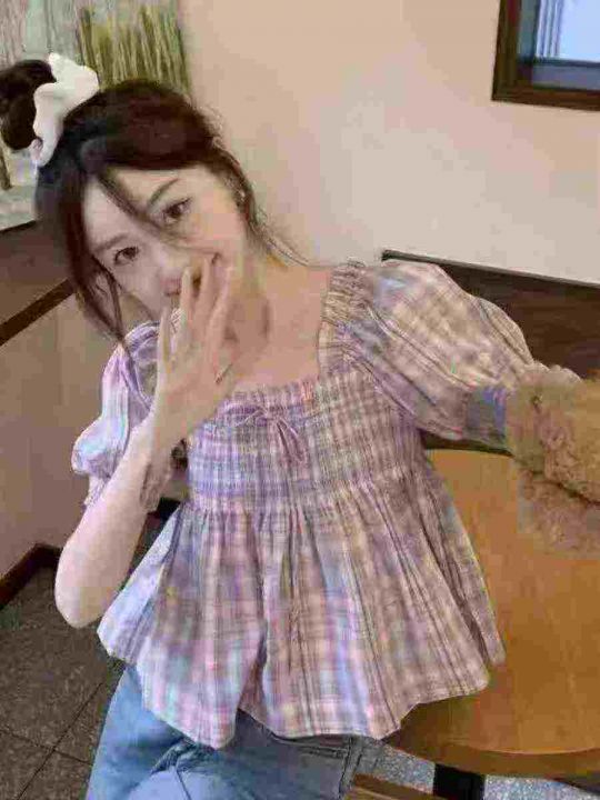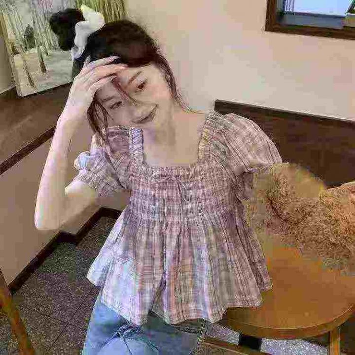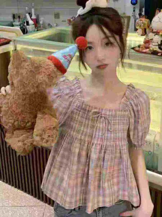 甜美彩色格子条纹方领泡泡袖上衣,[爱心]60件左右,款号#7023,码数S-2XL,穿80-140斤,万佳档口货,原包装️无瑕疵,(模特图仅供参考),[666]实体店品质