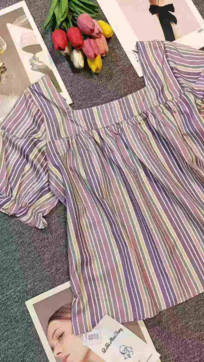 上新全清:10.8一件甜美彩色格子条纹方领泡泡袖上衣,...