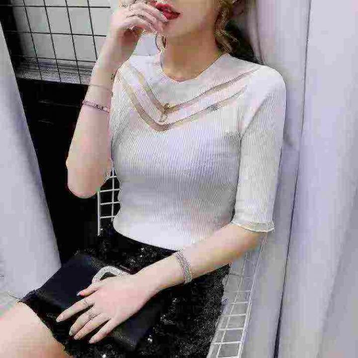 冰丝雪纺拼纱上衣女2025圆领修身显瘦春秋中袖蕾丝镂空百搭上衣,独立包装,均码,930件,清7.5,分➕1