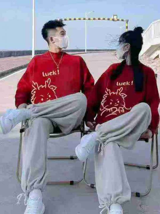 秋冬新款宽松慵懒风情侣装酒红色圆领包芯纱提花套头毛...