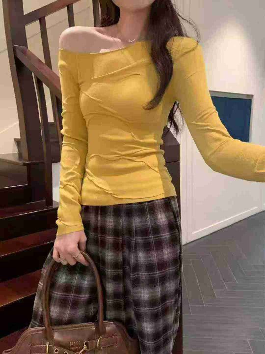 早秋新款纯欲风高级感穿搭气质斜肩长袖包芯纱套头毛衣...