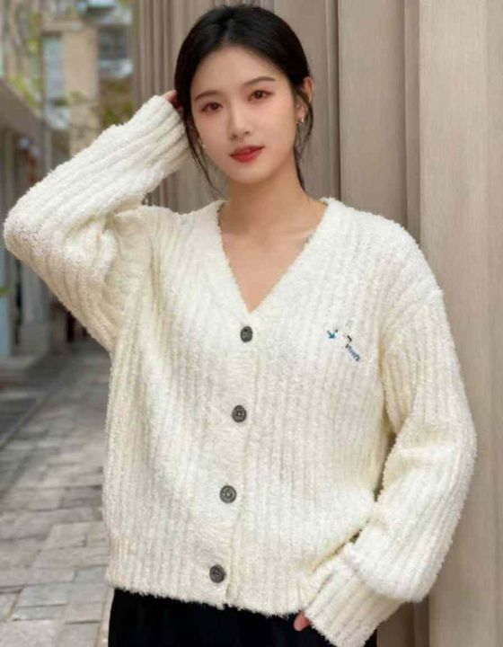 秋冬新款宽松百搭净版简约小刺绣标V领软糯珊瑚绒毛衣开衫,独立包装,均码...