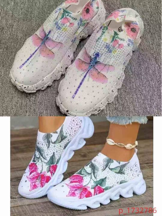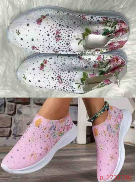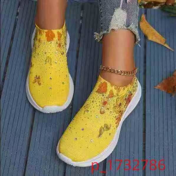 外贸大码男女鞋春季透气运动休闲鞋水钻彩虹闪亮飞织鞋...