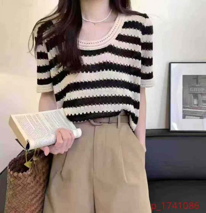 夏季新款冰丝宽松撞色条纹针织短袖,独立包装,均码宽松版,面料柔软舒适有质感,1340件,全清5.9元超低价秒杀!分货加一! _@_@