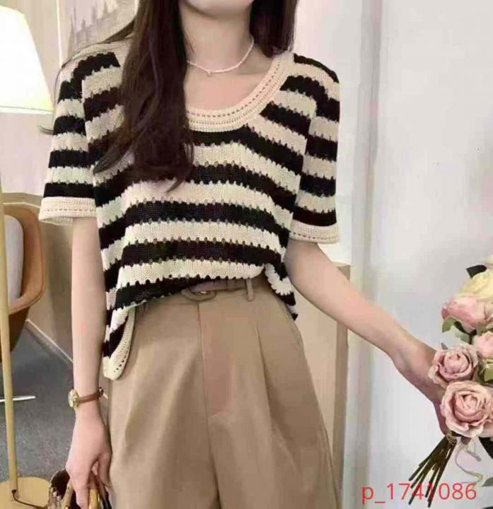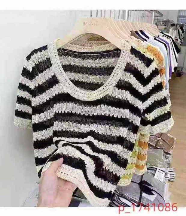 夏季新款冰丝宽松撞色条纹针织短袖,独立包装,均码宽...