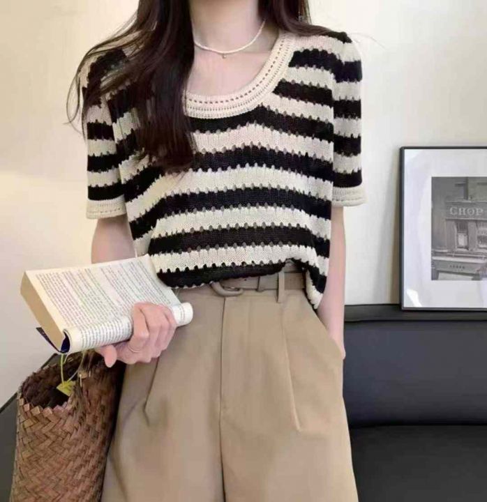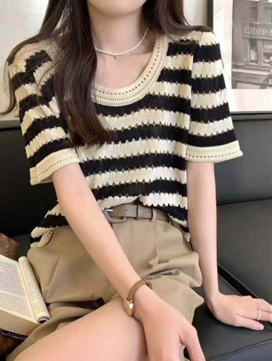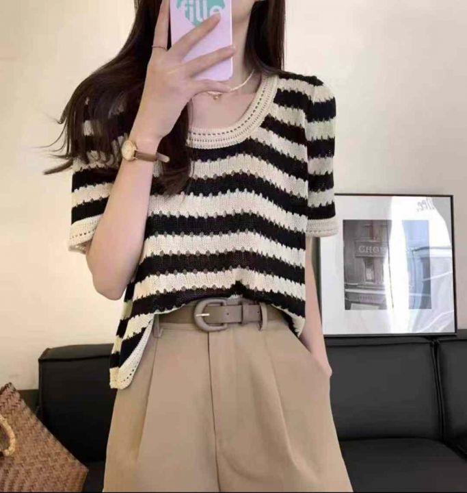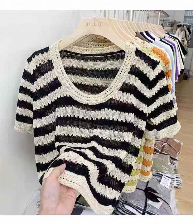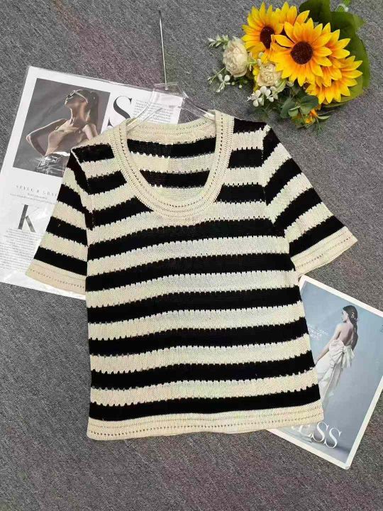 夏季新款冰丝宽松撞色条纹针织短袖,独立包装,均码宽...