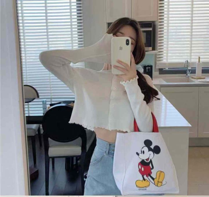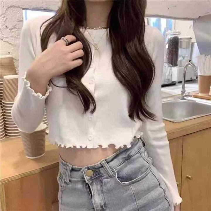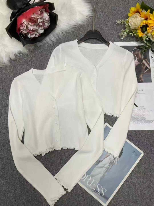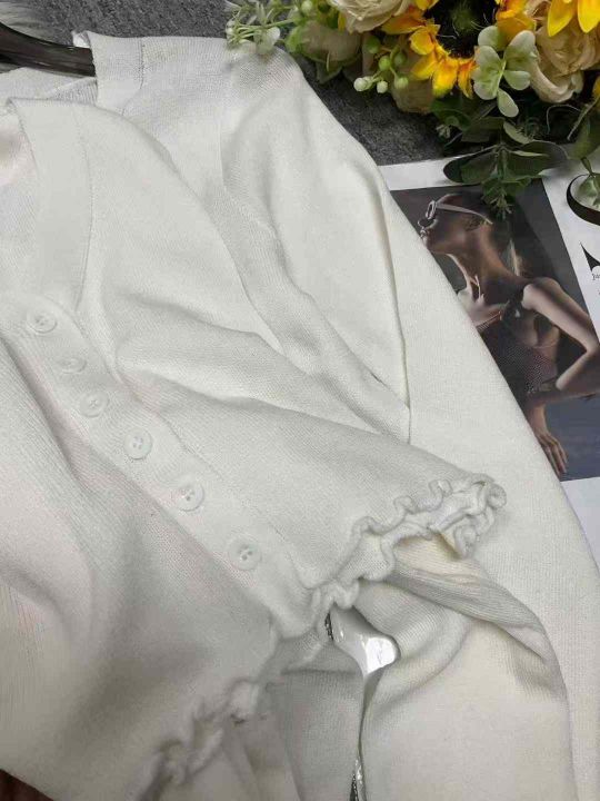 秋季新品设计款V领木耳边针织毛衣开衫,独立包装,均...
