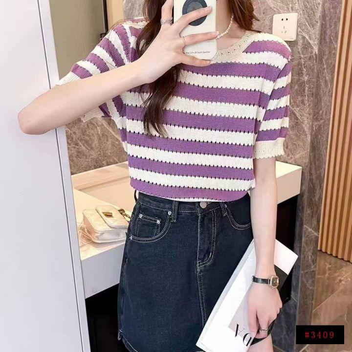 夏季新款港味风绝美撞色条纹圆领宽松正肩显瘦冰丝针织短袖,独立包装,均码...