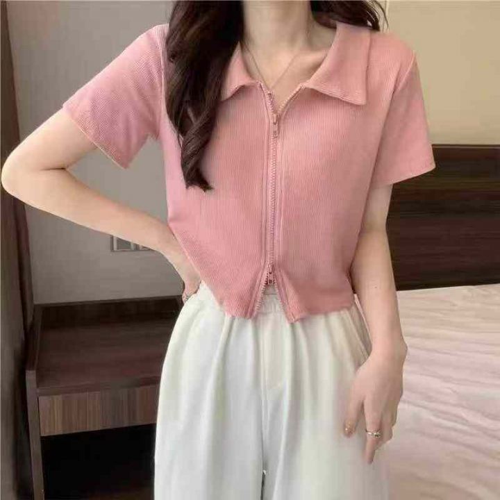 [月亮]:5.9清150件(不分货)[月亮]:粉色Polo领双拉链短袖辣妹棉质上衣[...