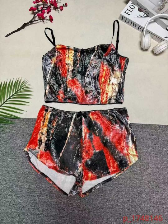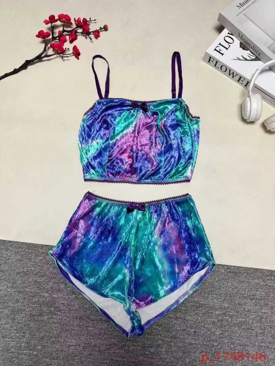 欧美时尚性感金丝绒扎染斑纹吊带短裤两件套,数量1000套左右,码数S-2XL,一个款花型多色,品质好,拉链式独立包装。