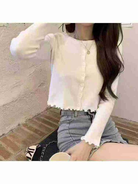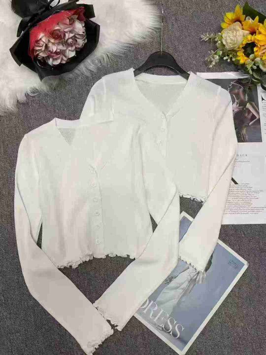 秋季新品设计款V领木耳边针织毛衣开衫,独立包装,均...