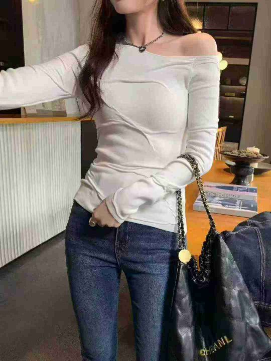 早秋新款纯欲风高级感肌理纹斜肩长袖包芯纱套头毛衣,...