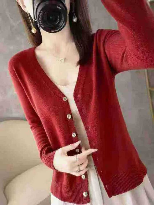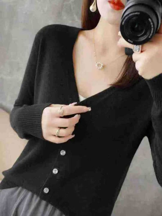 早秋新款百搭V领针织衫开衫外套短款毛衣外套上衣纯色...