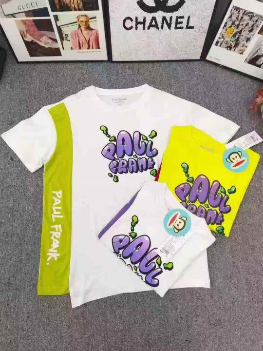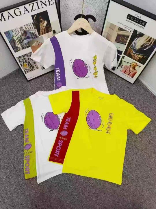 品牌童装新款潮牌百搭痞帅字母圆领T恤 数量3000件左右 尺码110--160 整款三个品牌 三个色 后领包边 独立包装带吊牌(大嘴猴、史努比、森马) 货品整洁质佳 100件起