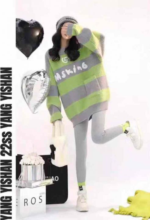 秋冬新款大码宽松休闲慵懒风字母印花口袋条纹粗针圆领套头毛衣,独立包装,...